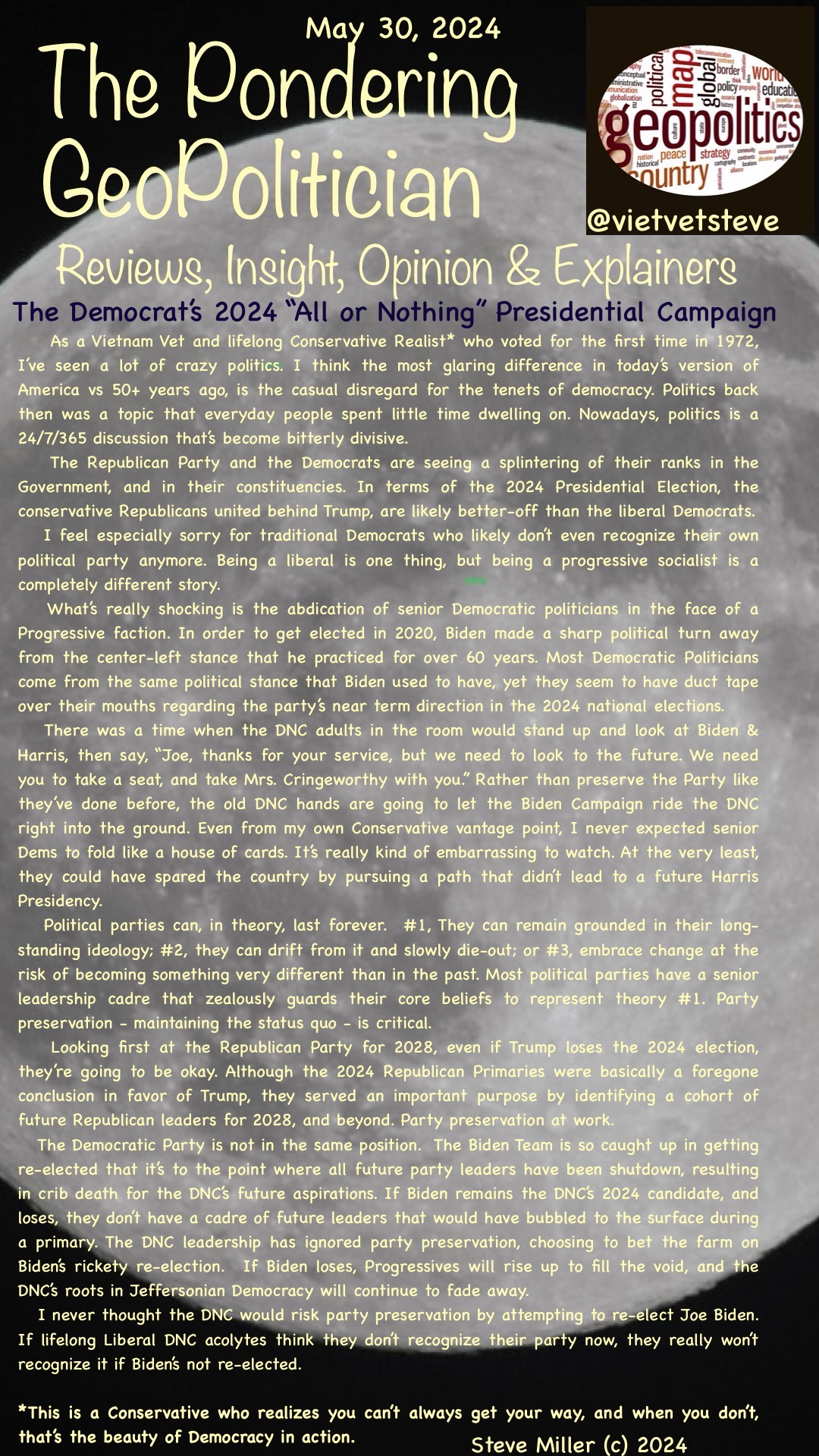 Share this: Click to share on X (Opens in new window) X Click to email a link to a friend (Opens in new window) Email Click to share on Pocket (Opens in new window) Pocket Click to share on X (Opens in new window) X Like Loading... National Security, U.S. PresidencyThe Democrat’s 2024 “All or Nothing” Presidential Campaign The Democrat’s 2024 “All or Nothing” Presidential Campaign Image