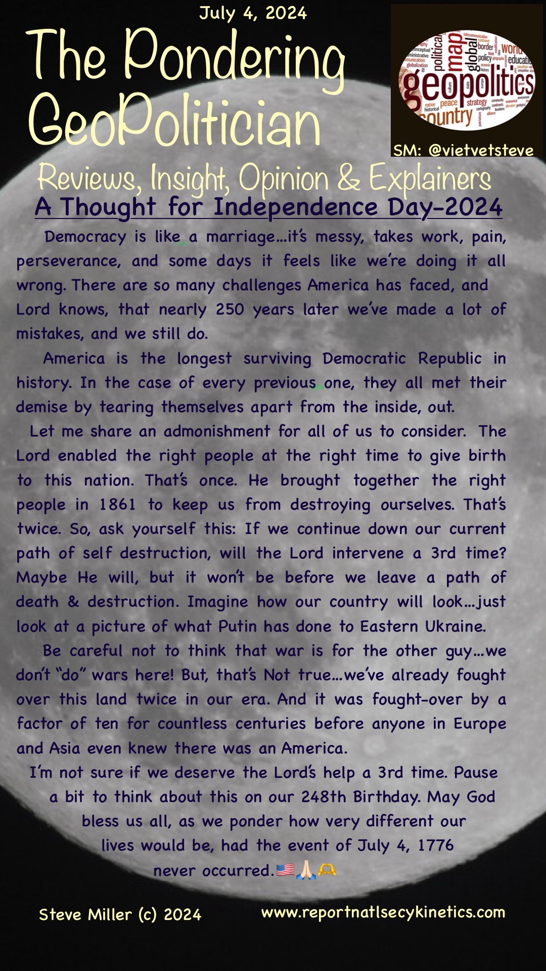 Share this: Click to share on X (Opens in new window) X Click to email a link to a friend (Opens in new window) Email Click to share on Pocket (Opens in new window) Pocket Click to share on X (Opens in new window) X Like Loading... American Society, Election 2024, National SecurityA Thought for Independence Day-2024 Image