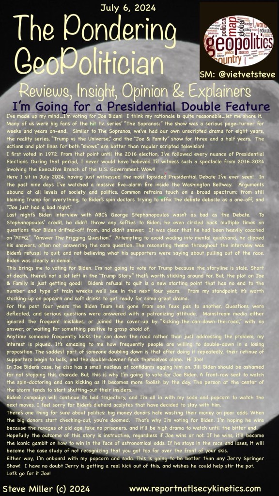Donald Trump, Election 2024, Joe Biden, National Security, The Judiciary, U.S. PresidencyAmerica’s Messy Presidential Politics (satire) Share this: Click to share on X (Opens in new window) X Click to email a link to a friend (Opens in new window) Email Click to share on Pocket (Opens in new window) Pocket Click to share on X (Opens in new window) X Like Loading... Standard